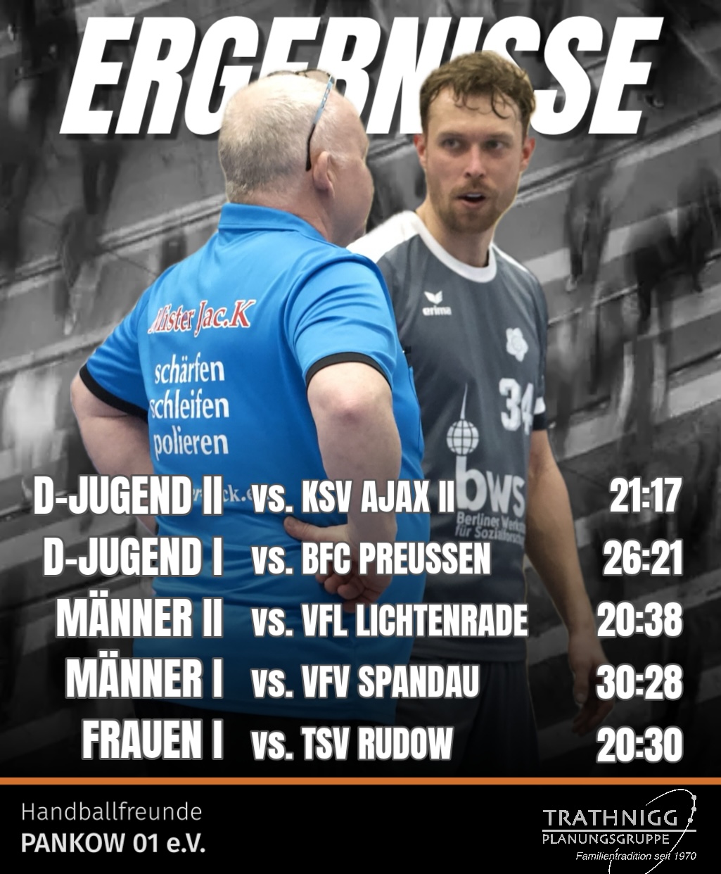 Während die 2. Männer gegen Lichtenrade zwar kämpfen, aber keine Chance haben, und auch die 1. Frauen gegen die direkte Konkurrenz Federn lassen, können beide D-Jugend-Teams Punkte einfahren. Einen wichtigen Sieg im Kampf für den Klassenerhalt sichern sich zudem die 1. Männer. Gegen Spandau gibt es einen knappen umkämpften Sieg.