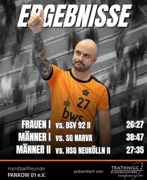 Weder die 1. Frauen noch beide Herrenmannschaften konnten gegen gute Gegner Punkte einfahren. Während es bei den Frauen noch denkbar knapp ausgefallen ist, unterlagen die 1. Herren gegen bockstarke Handballer von NARVA (die bis dahin auch nur eine Niederlage zu verzeichnen hatten) deutlich. Die 2. Herren konnten lange Zeit auf Augenhöhe in Neukölln mitspielen, hat aber 15 Minuten vor Schluss nicht mehr mithalten können. So konnten die Gegner uneinholbar davonziehen.